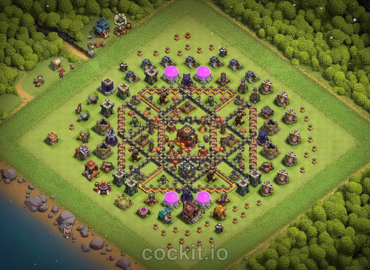 TH10 Hybrid layouts are designed to counter the current TH10 attack meta. This base targets level 10 play and leans toward Hybrid strategy, balancing defensive priorities with resource protection.