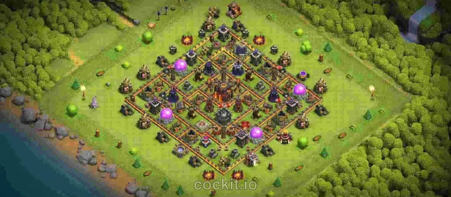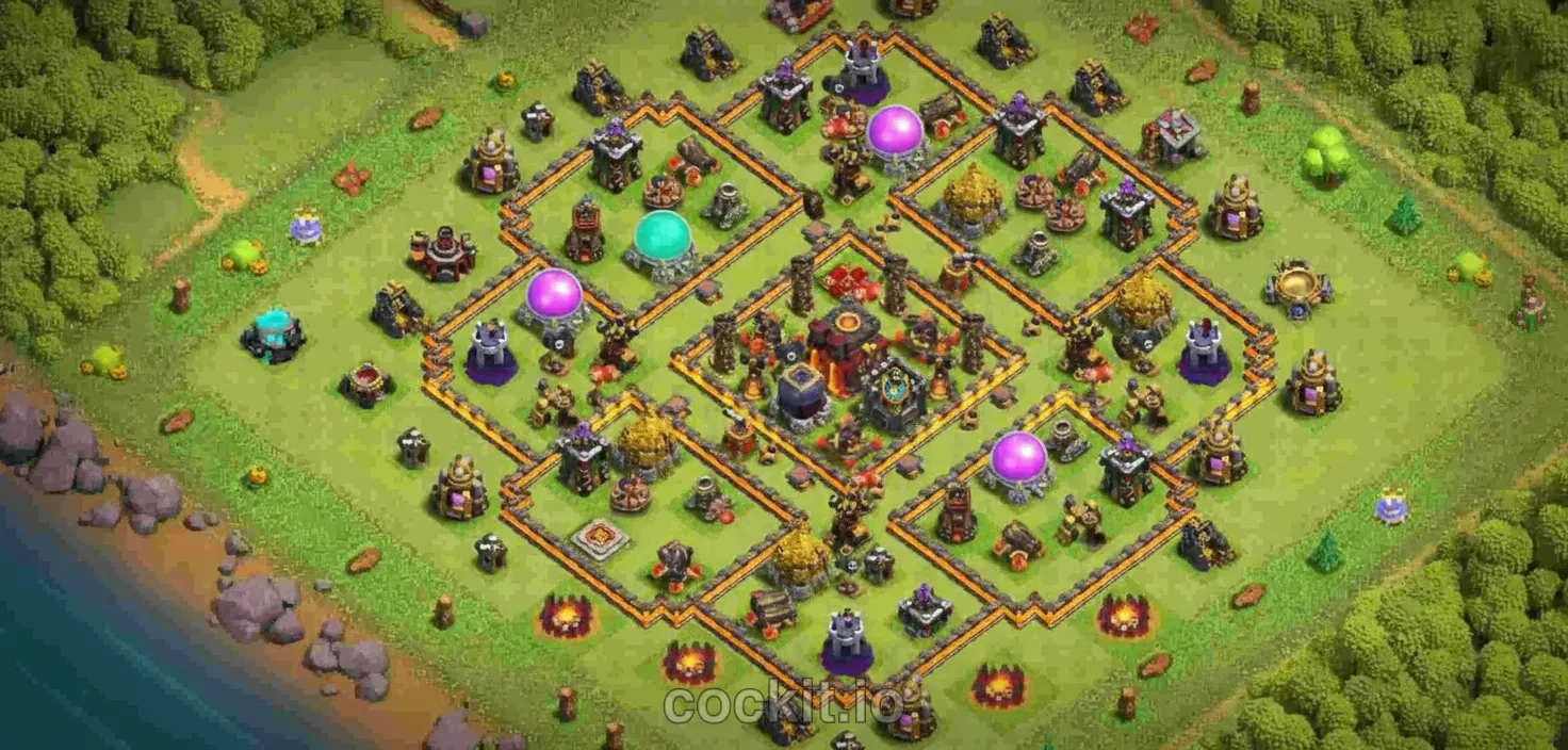 Hybrid bases at TH10 combine farming and trophy logic — protect storages AND the Town Hall simultaneously. They are the most-copied layout type because they work in both legend league and normal ladder play.