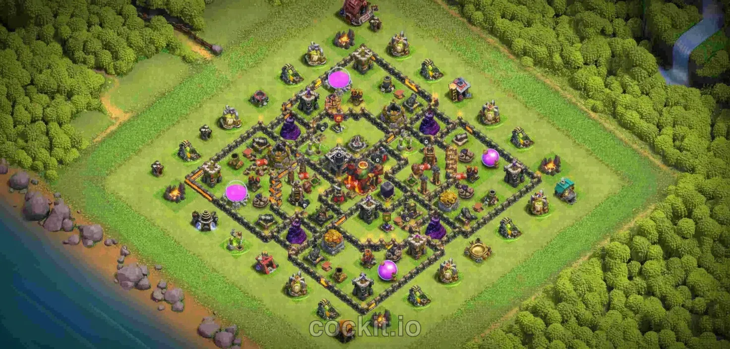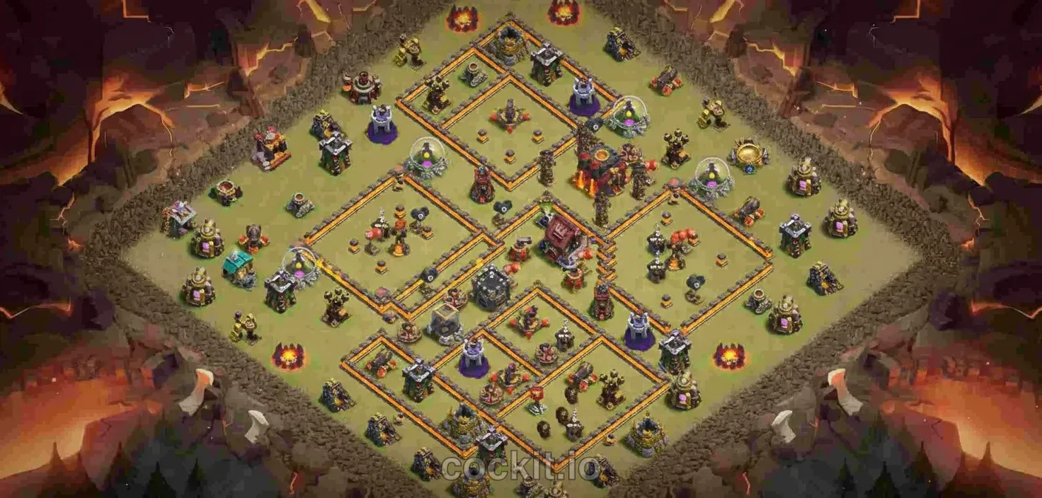 War bases at TH10 are designed to deny 3-star attacks during regular wars and Clan War Leagues. They prioritize splash damage positioning, heavy wall compartments around the Town Hall, and anti-queen walk layouts that absorb hero charges.