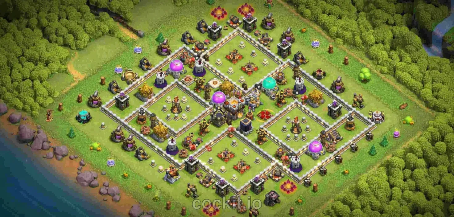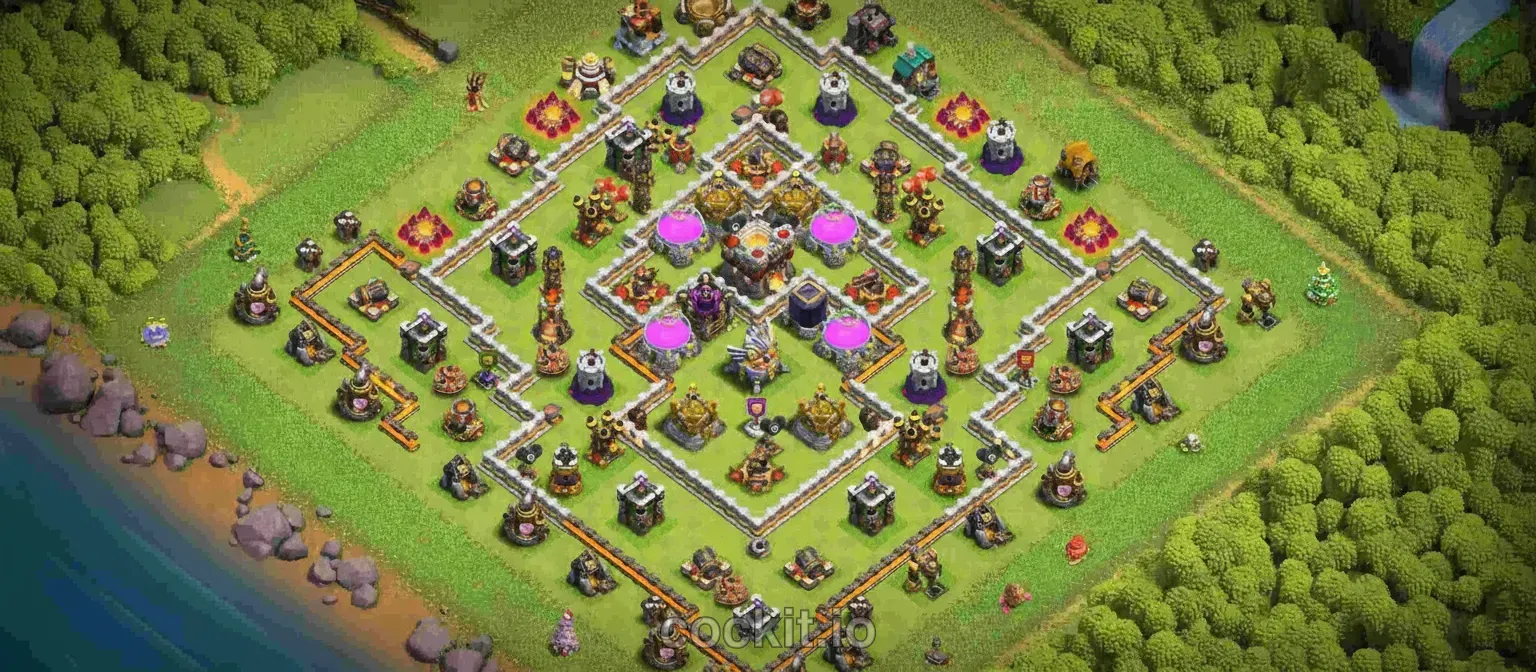 Trophy bases at TH11 aim to deny 2-star attacks so you hold your league position. They sacrifice resource protection in favor of survival — the Town Hall sits near the core with overlapping defensive fire.