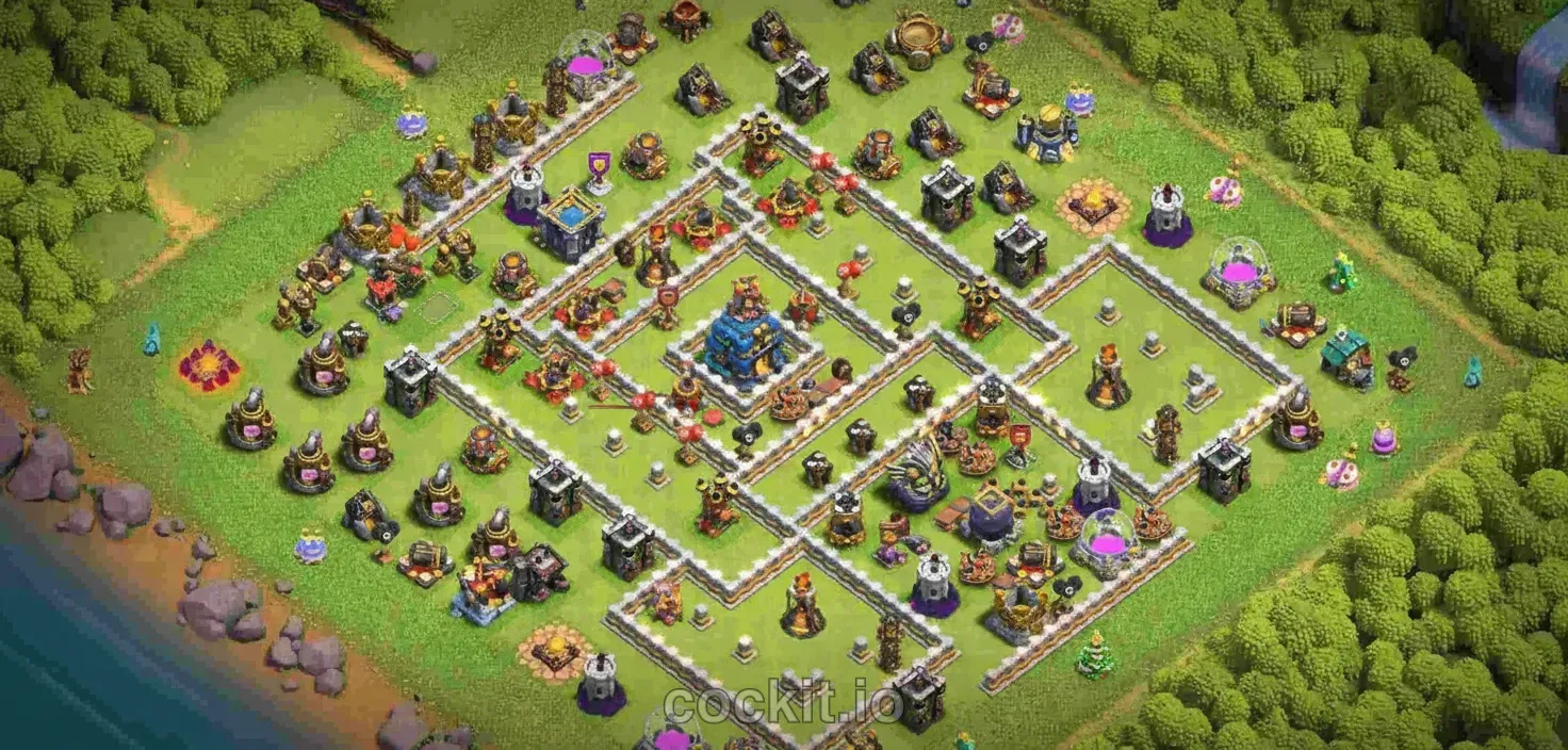 Trophy bases at TH12 aim to deny 2-star attacks so you hold your league position. They sacrifice resource protection in favor of survival — the Town Hall sits near the core with overlapping defensive fire.
