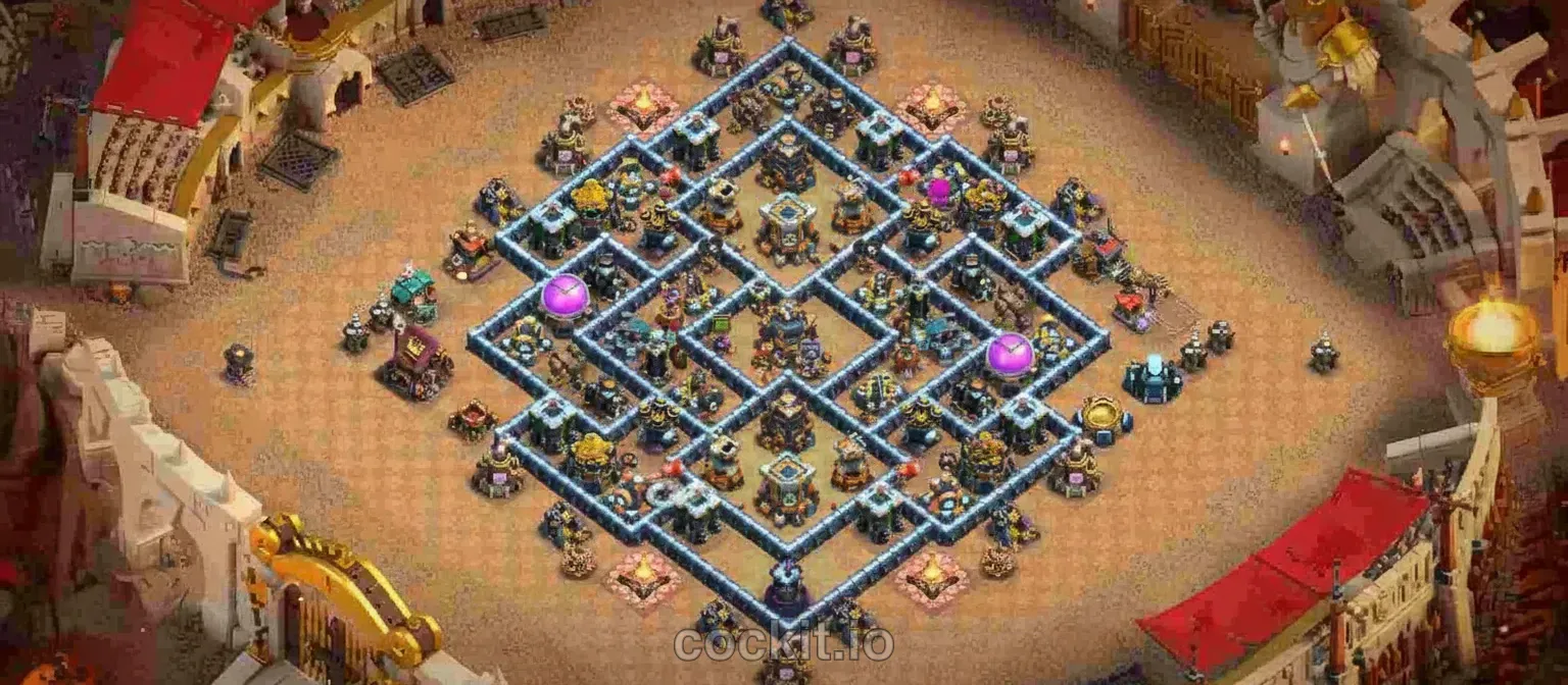 Farming bases at TH13 focus on protecting your dark elixir, gold and elixir storages from loot raids. Walls funnel troops away from collectors while defensive structures cover the resources deepest inside the base.