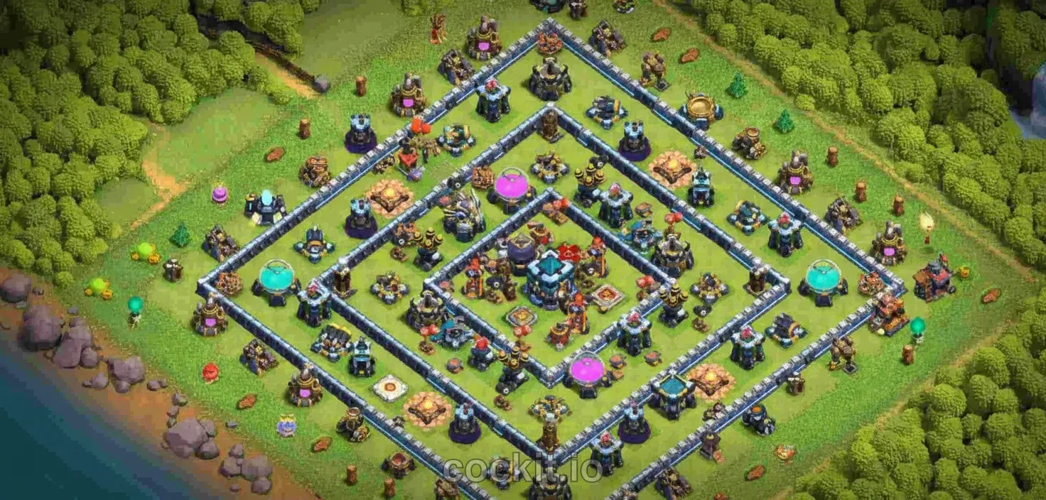 Trophy bases at TH13 aim to deny 2-star attacks so you hold your league position. They sacrifice resource protection in favor of survival — the Town Hall sits near the core with overlapping defensive fire.