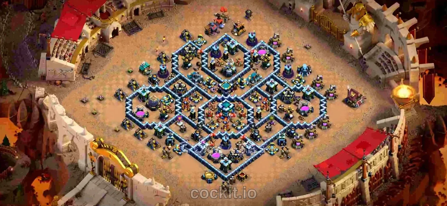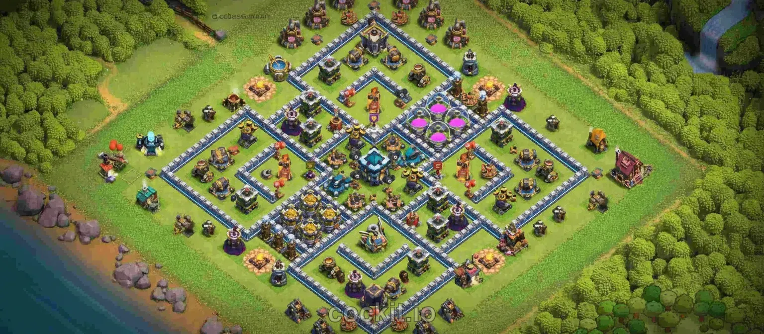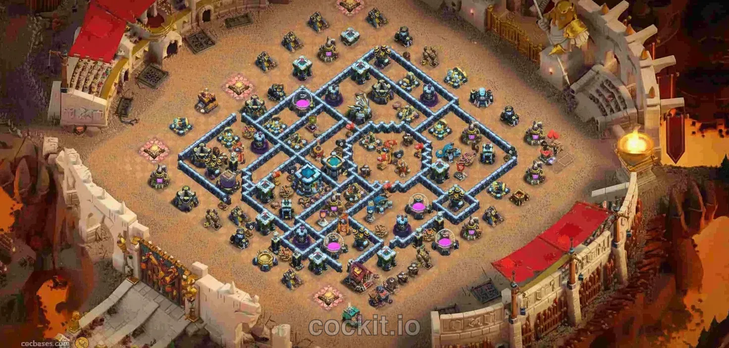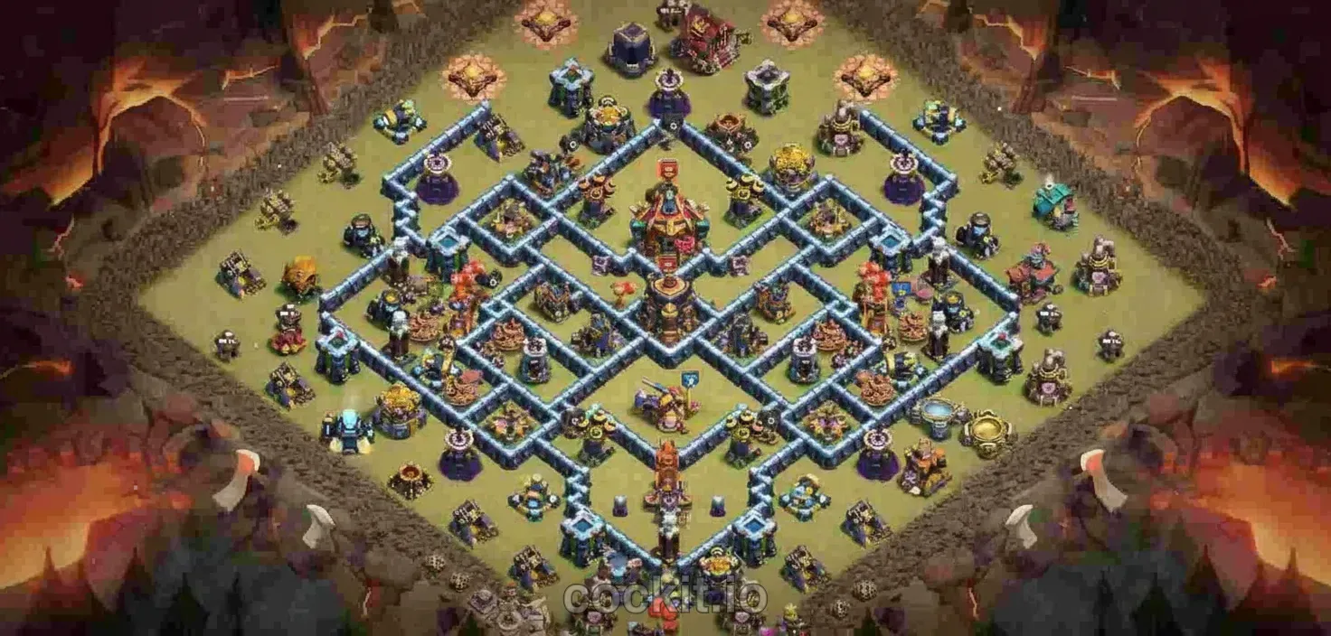 War bases at TH13 are designed to deny 3-star attacks during regular wars and Clan War Leagues. They prioritize splash damage positioning, heavy wall compartments around the Town Hall, and anti-queen walk layouts that absorb hero charges.