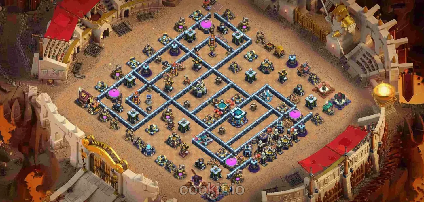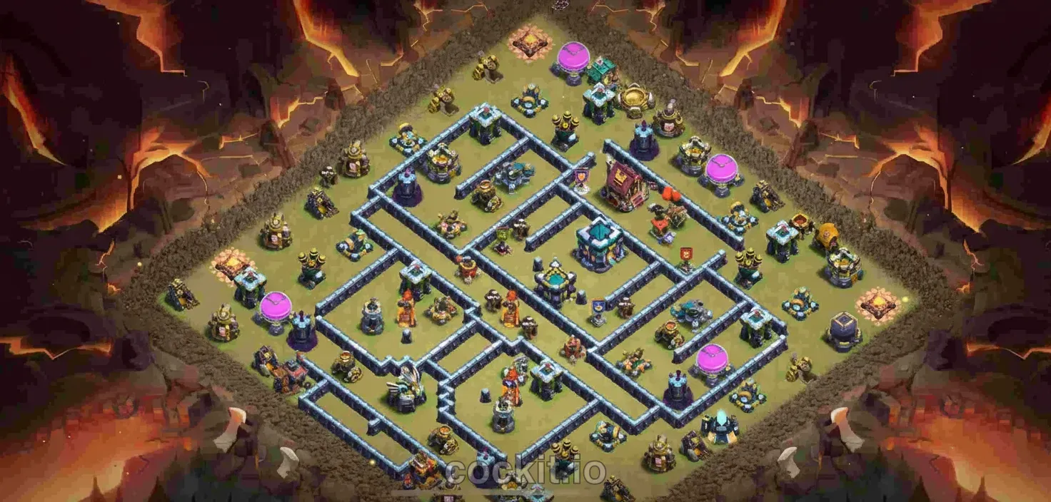 War bases at TH13 are designed to deny 3-star attacks during regular wars and Clan War Leagues. They prioritize splash damage positioning, heavy wall compartments around the Town Hall, and anti-queen walk layouts that absorb hero charges.