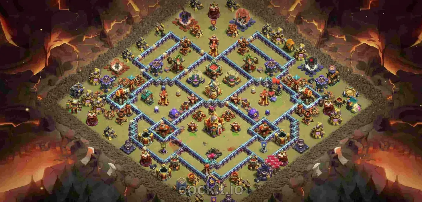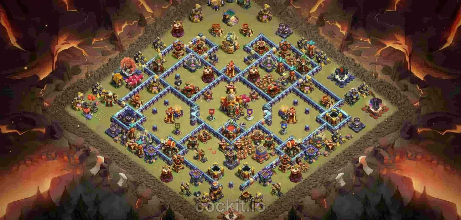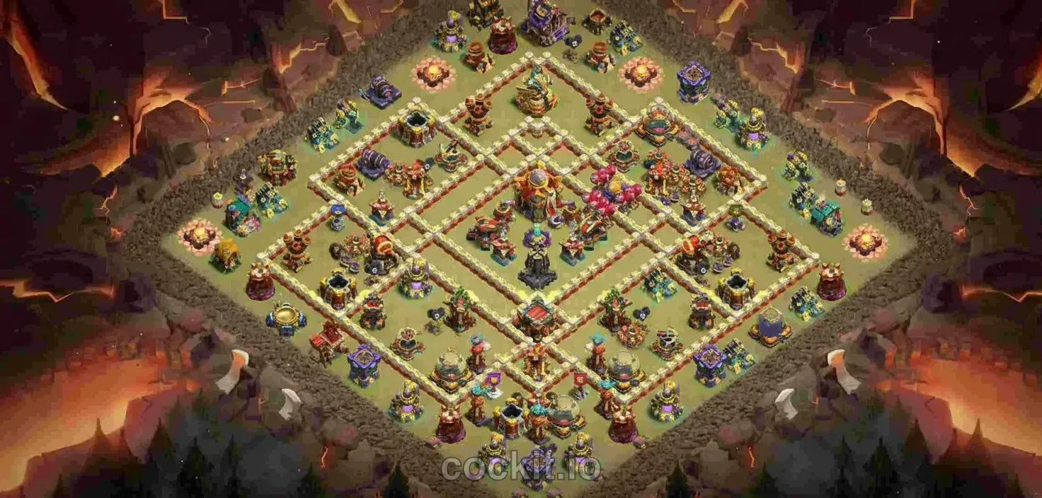 War bases at TH16 are designed to deny 3-star attacks during regular wars and Clan War Leagues. They prioritize splash damage positioning, heavy wall compartments around the Town Hall, and anti-queen walk layouts that absorb hero charges.