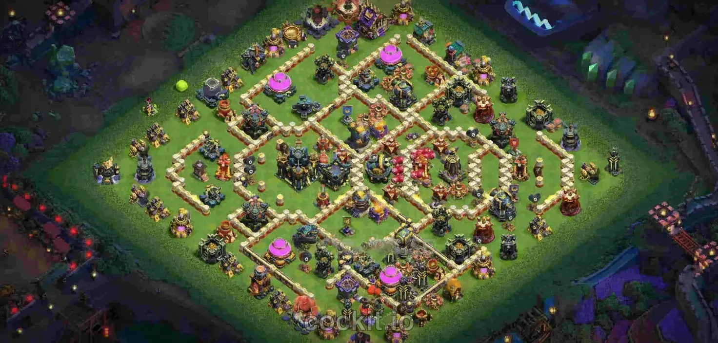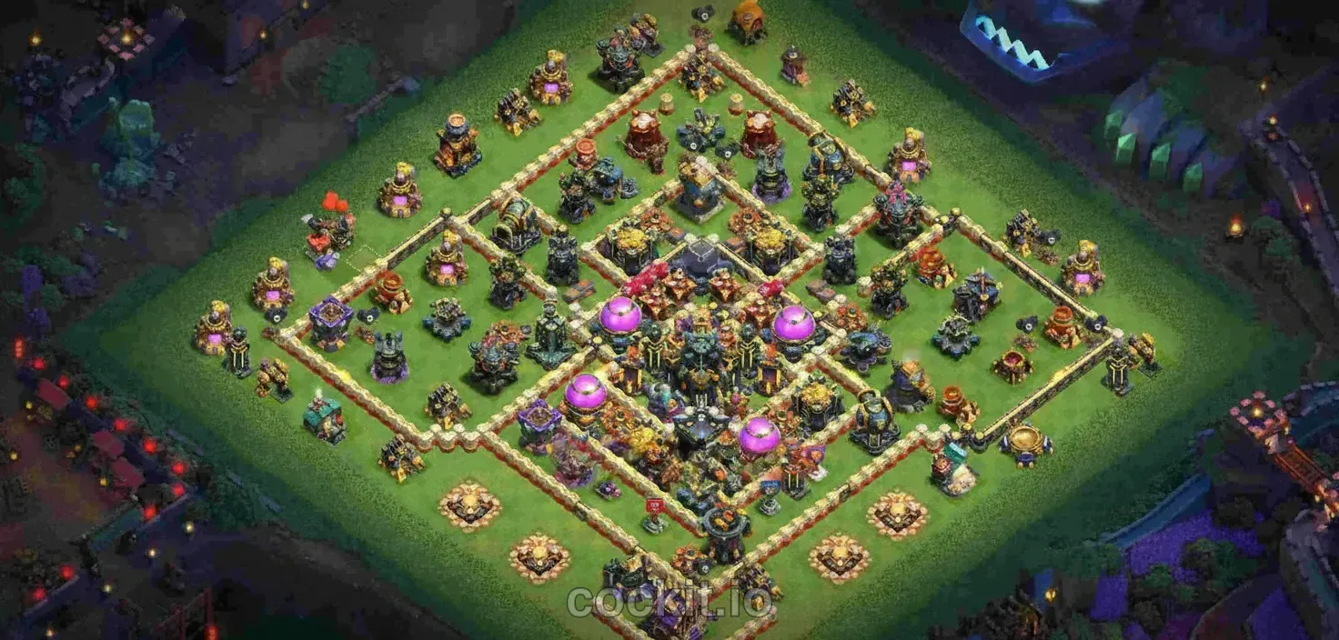 Farming bases at TH17 focus on protecting your dark elixir, gold and elixir storages from loot raids. Walls funnel troops away from collectors while defensive structures cover the resources deepest inside the base.