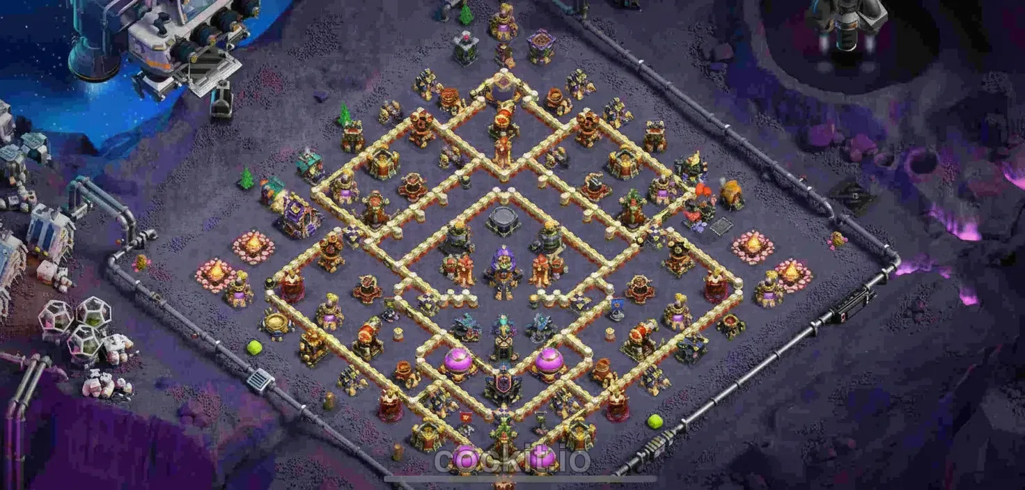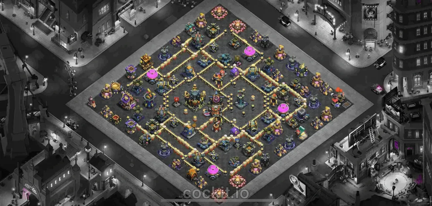 War bases at TH17 are designed to deny 3-star attacks during regular wars and Clan War Leagues. They prioritize splash damage positioning, heavy wall compartments around the Town Hall, and anti-queen walk layouts that absorb hero charges.