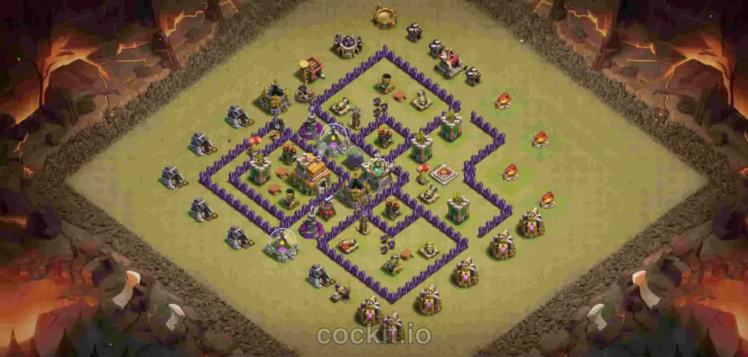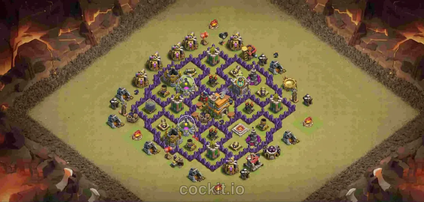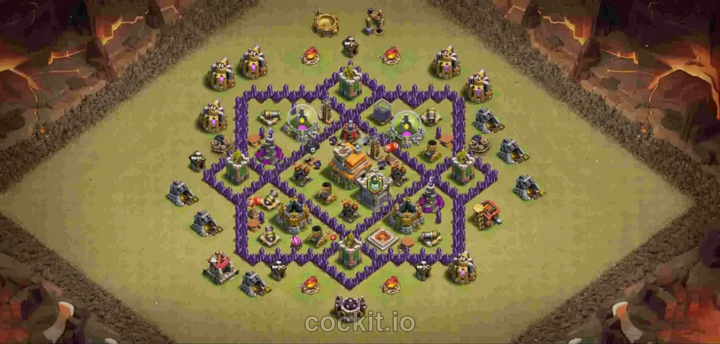 CWL (Clan War League) bases at TH7 are tuned for competitive three-star denial. Expect carefully placed scattershots, eagle artilleries and warden cover to deflect meta attacks like smash, queen charge and blimp routes.