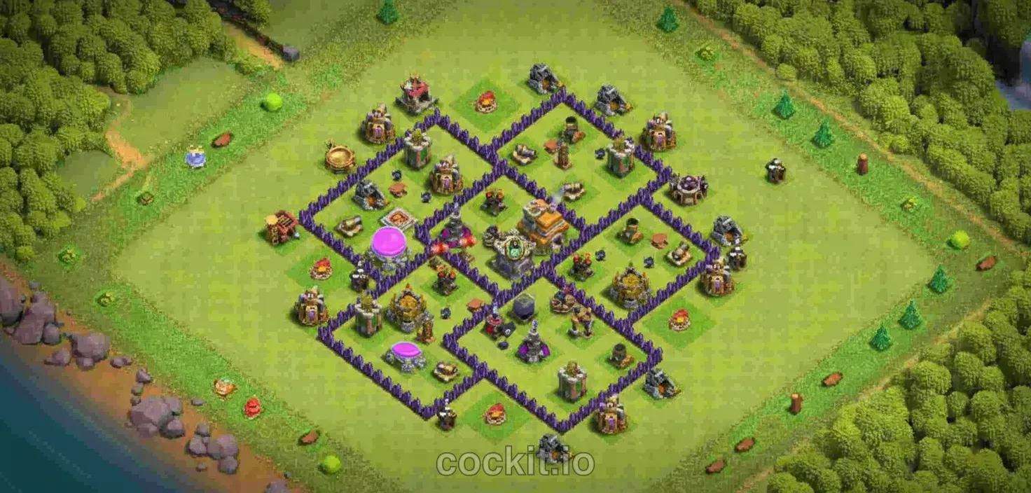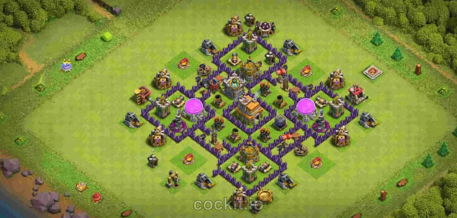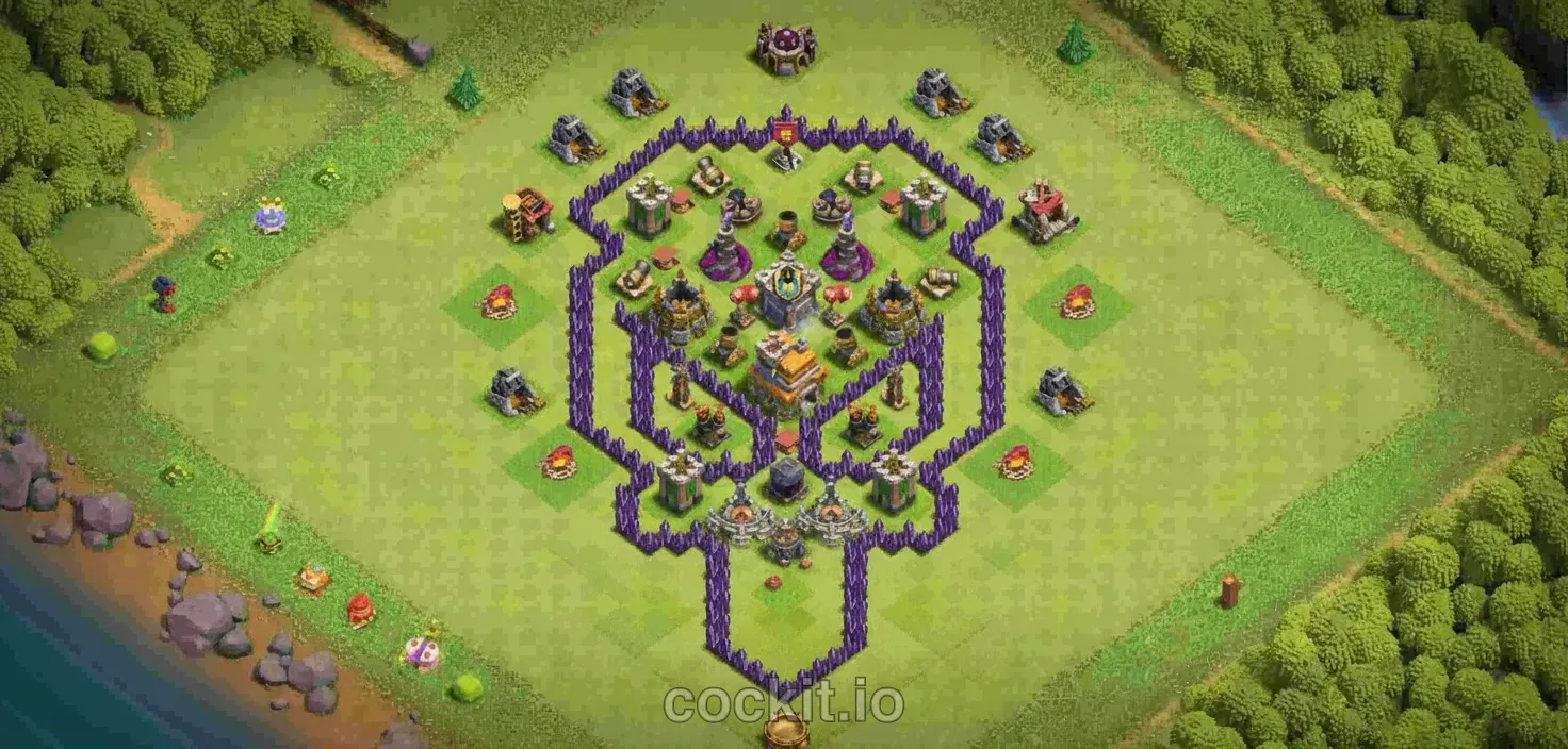 Farming bases at TH7 focus on protecting your dark elixir, gold and elixir storages from loot raids. Walls funnel troops away from collectors while defensive structures cover the resources deepest inside the base.