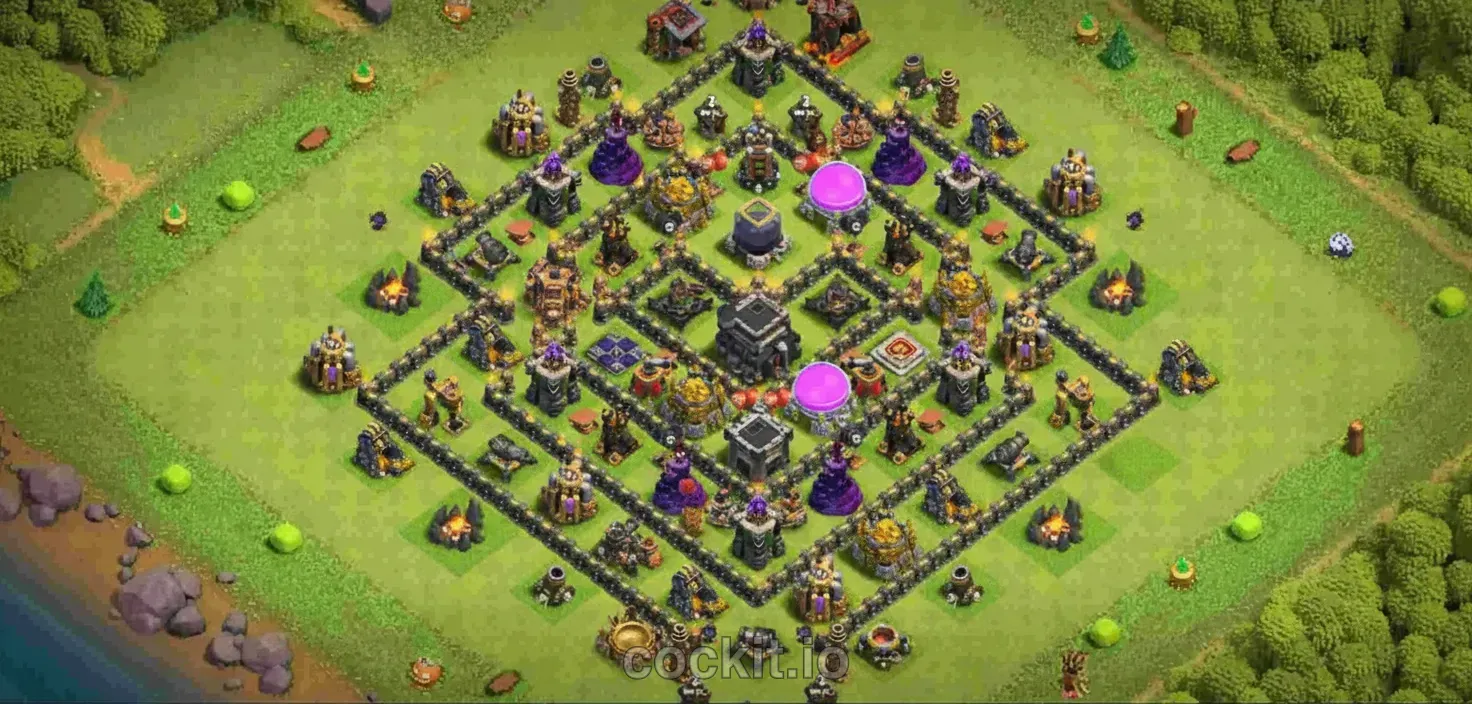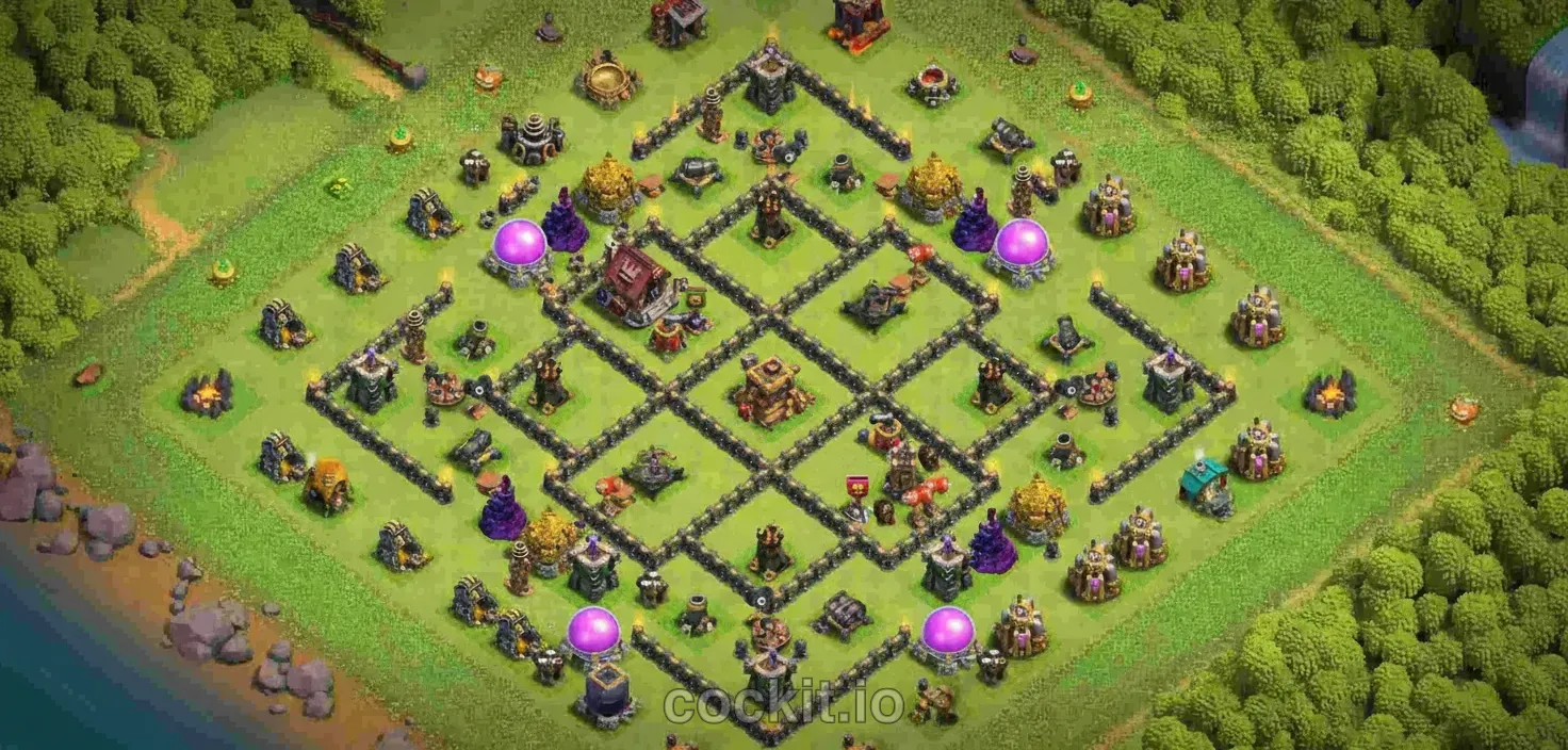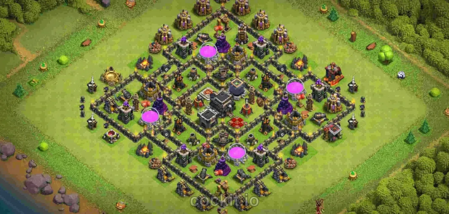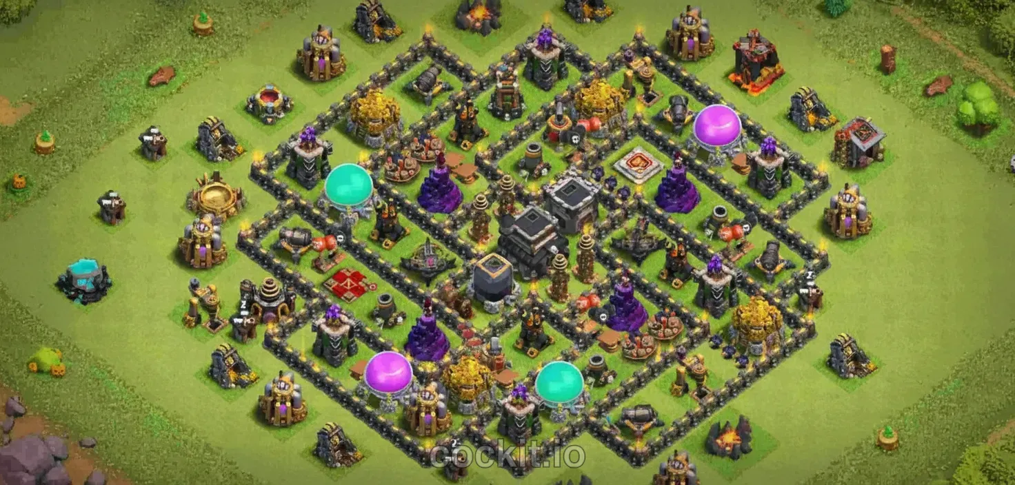 Farming bases at TH9 focus on protecting your dark elixir, gold and elixir storages from loot raids. Walls funnel troops away from collectors while defensive structures cover the resources deepest inside the base.