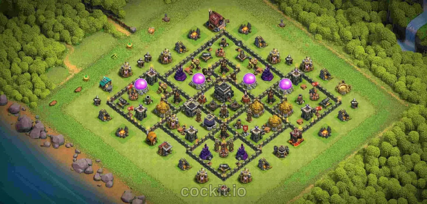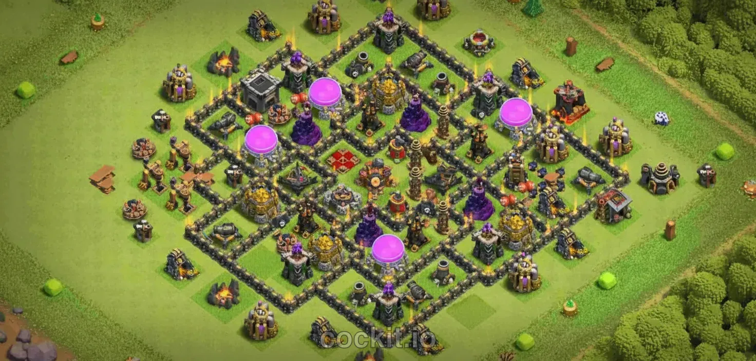 Farming bases at TH9 focus on protecting your dark elixir, gold and elixir storages from loot raids. Walls funnel troops away from collectors while defensive structures cover the resources deepest inside the base.