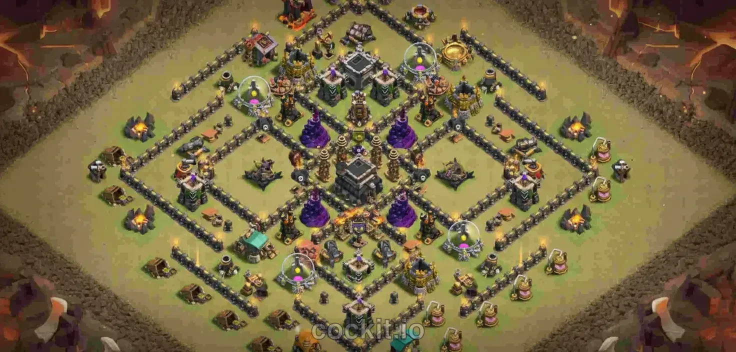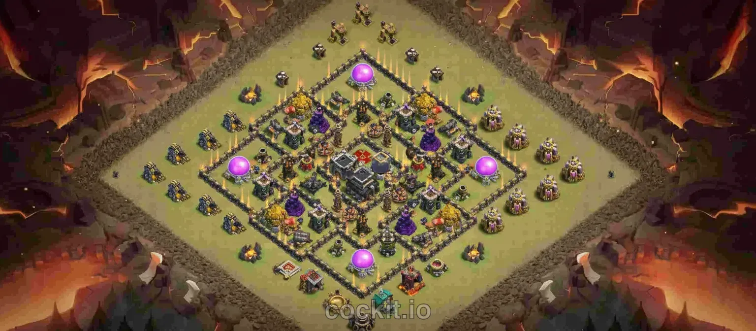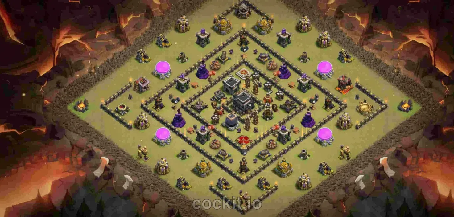 War bases at TH9 are designed to deny 3-star attacks during regular wars and Clan War Leagues. They prioritize splash damage positioning, heavy wall compartments around the Town Hall, and anti-queen walk layouts that absorb hero charges.